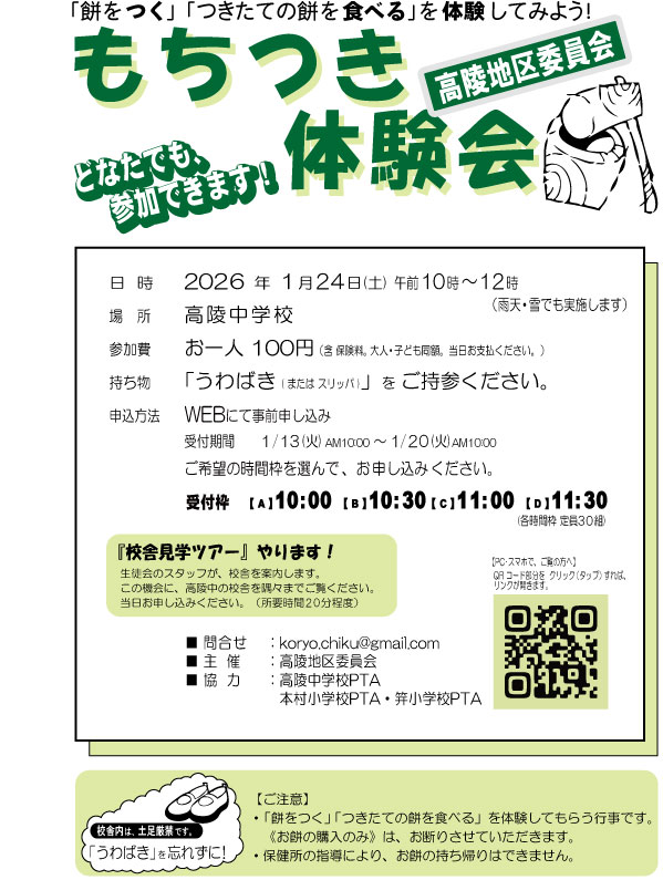 カテゴリー 餅つき大会 2026餅つき体験会■受付 投稿者 作成者: 高陵地区委員会 投稿日 2026年1月13日 1/24 開催の「餅つき体験会」の受付です。 餅つき体験会の参加申込です。ご希望の受付時間を選択し、お申し込みください。(1度の申し込みで4名まで) 【A】10:00 【B】10:30 【C】11:00 【D】11:30 ← 2026 スキー体験会、餅つき体験《予告》 → 2026スキー体験会■受付延長しました