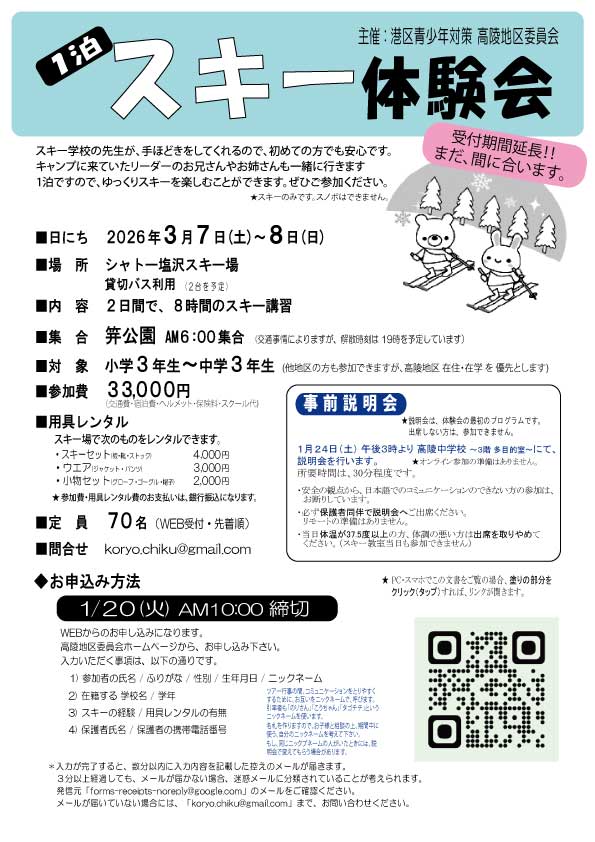 カテゴリー スキー体験会 2026スキー体験会■受付終了 投稿者 作成者: 高陵地区委員会 投稿日 2026年1月14日 3/7~8 に開催予定の「スキー体験会」の申し込みです。 受付を終了しました。 ← スポーツ大会 2025 → 餅つき体験会2026