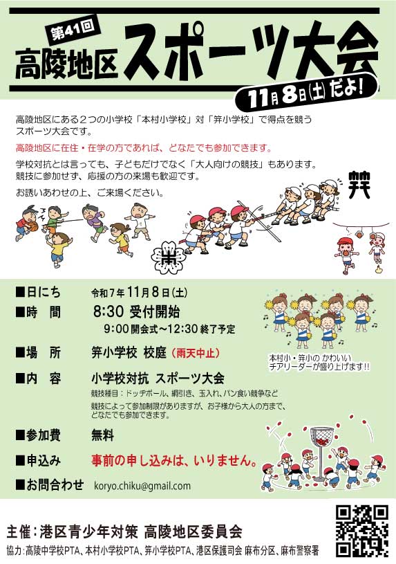 カテゴリー 小学校対抗 スポーツ大会 スポーツ大会 2025 投稿者 作成者: 高陵地区委員会 投稿日 2025年10月27日 11/8(土)に 笄小学校の校庭をお借りして『スポーツ大会』を開催します。 現在、準備を進めています。参加費はいりません。 事前のお申し込みは、いりません。 ← スポーツ大会■日程変更